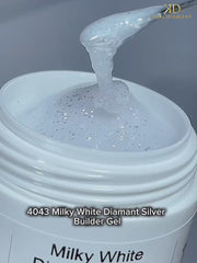 Glitter Builder Gel in Milky White mit Silver-Glitter, ideal als Modelliergel, für Nailart und Ombre-Designs. Die harmonische Kombination aus zartem Milky-White-Ton und Schimmereffekt verleiht dem Nageldesign eine sanfte Milky-Optik mit feinem Schimmer.